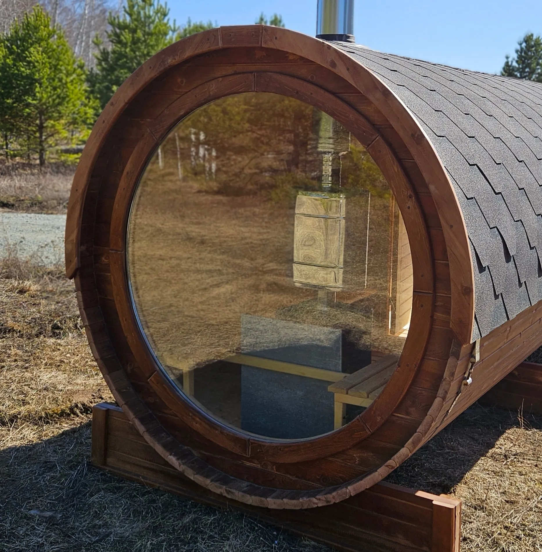Это изделие круглой вытянутой формы с тремя отделениями: раздевалкой, моечной и парной. Во всех трех отделениях с обеих сторон установлены лавочки из кедра. Печь находится в парилке около дальней стены. Для удобства пользования в бане висят полочки из кедра и вешалка в раздевалке. Время растопки такой бани не превышает 30 минут. По вашему желанию баню-бочку можно дополнить печью с внешней загрузкой, благодаря которой весь мусор после топки останется на улице. Круглая баня-бочка не требует полноценный фундамент, поэтому при необходимости ее можно перенести в другое место.