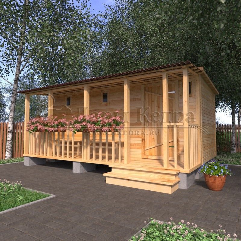 Это классическая прямоугольная модель бани с тремя отделениями: предбанником, моечной и парилкой. Для удобства пользования предбанник оснащен лавочкой и вешалкой. В моечной находится лавка и полочка из кедра. Парилка оборудована двухуровневым открытым полком и печью. Время растопки такой бани не превышает 30 минут. На просторной веранде можно оставить вещи или отдохнуть после парения. Каркасно-щитовую баню можно заказать как в готовом, так и в разборном варианте. В разборной модели готовые щиты из кедра быстро собираются в полноценное строение, что также позволяет исключить лишний строительный мусор. Такая баня не требует полноценный фундамент, поэтому при необходимости ее можно перенести в другое место.