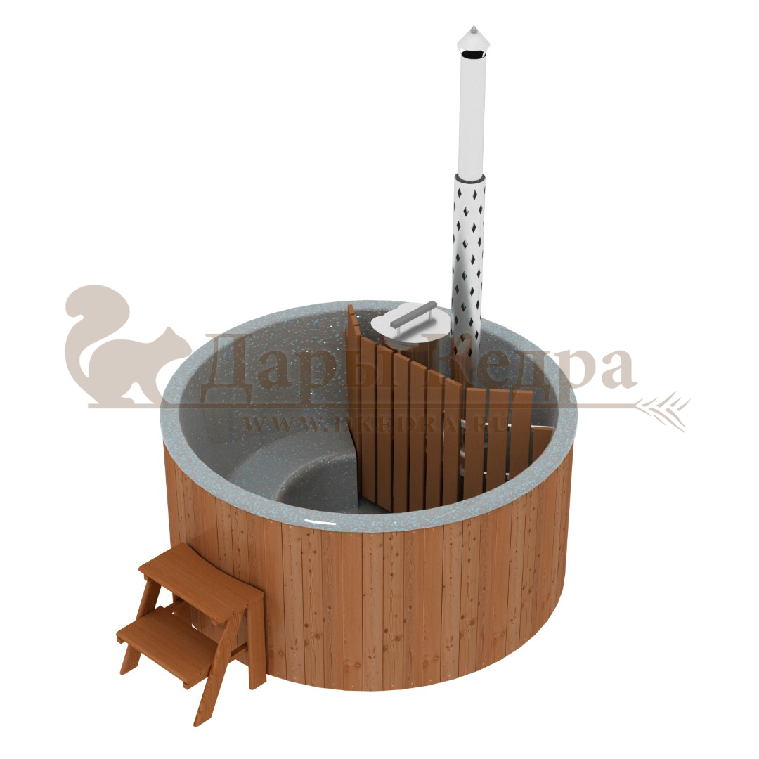 Финская круглая композитная купель с подогревом (с печкой) «Премиум 160 хот с печью 25 квт» Это уличная подогреваемая купель с круглой внутренней чашей, которая изготовлена из современного прочного и термоустойчивого материала (композита). Форма чаши обеспечивает комфортную посадку во время принятия процедур. Для удобства пользования купель оборудована приставной лестницей. Подогрев воды осуществляется внешней печью с дымоходом. Композитная вставка придает купели красивый внешний вид, продлевает срок службы и облегчает уход за изделием. Парение на свежем воздухе – это отличный способ укрепить здоровье и поддержать организм в тонусе.