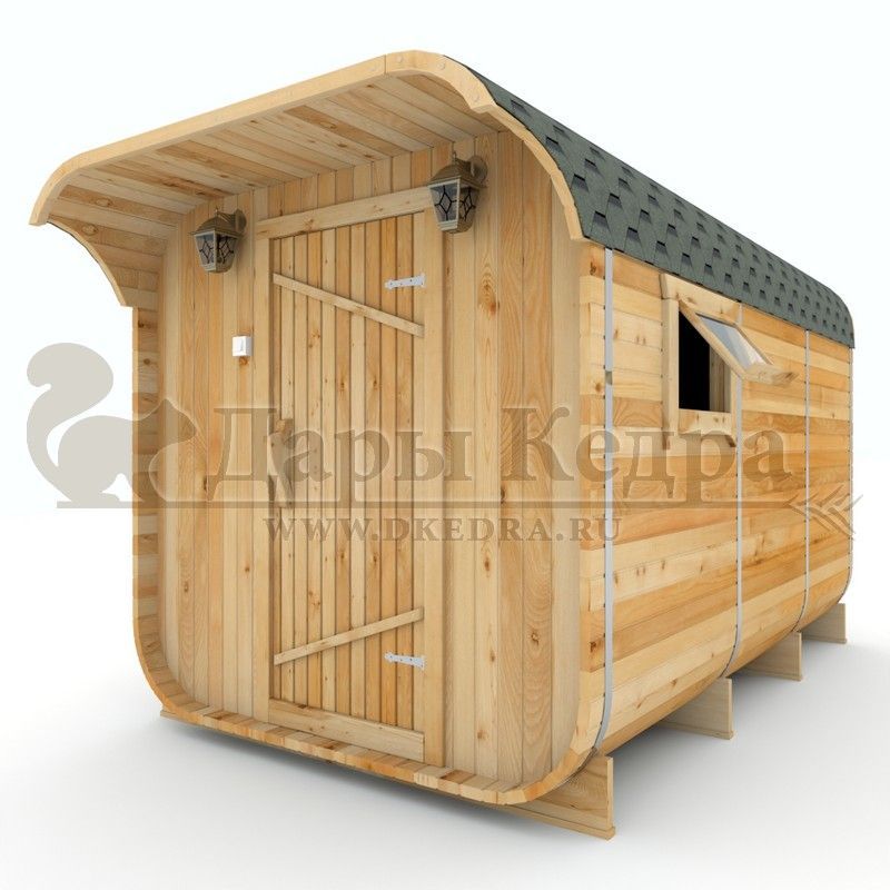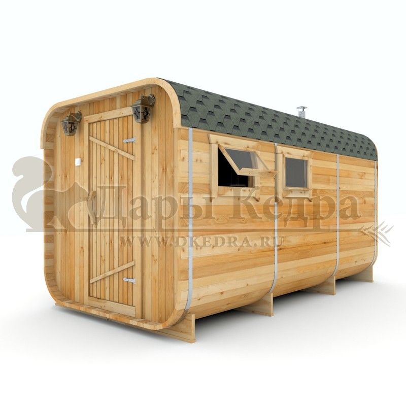 • Баня-бочка квадро из кедра с козырьком (все размеры) Это прямоугольное изделие с закругленными углами. За счет такой конструкции во время топки воздух циркулирует по кругу, поэтому баня-бочка нагревается не более 30 минут. Козырек не только украшает баню, но и защищает оставленную обувь от дождя. Лавочки из кедра находятся по всей длине бани-бочки с обеих сторон. Печь расположена в парилке около дальней стены. В зависимости от выбранного размера баня-бочка квадро с козырьком имеет следующую комплектацию: Баня-бочка квадро 2,5 метра - парилка; Баня-бочка квадро 3,5 и 4,5 метра - раздевалка, парилка; Баня-бочка квадро 5,5 метров - раздевалка, парилка, моечная. По вашему желанию ее можно укомплектовать печью с внешней загрузкой, благодаря которой весь мусор вовремя топки остается на улице. Баня-бочка квадро не требует полноценный фундамент, поэтому при необходимости ее можно перенести в другое место. Обращаем Ваше внимание, что в стандартную комплектацию бани входят лавки в парной с обеих сторон. Дополнительно можно заказать полок открытого или закрытого типа! Кедр обладает ароматическими свойствами. Он не деформируется и влагоустойчив, при правильном уходе за деревом на нем не развиваются грибки и плесень. Обращаем Ваше внимание, что данную модель бани-бочки можно изготовить с ровным полом. Эта дополнительная опция и оплачивается отдельно!