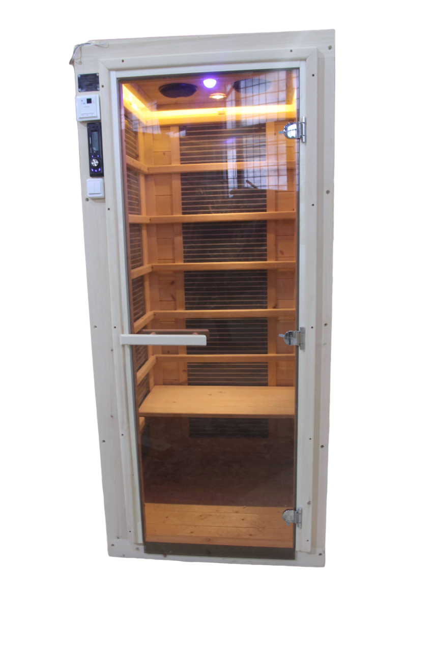 Это специально оборудованная кедровая кабина для прогрева тела человека сухим теплом. Воздух в таких парных не нагревается. Инфракрасные лучи воздействуют на тело, равномерно прогревая мышцы, суставы и органы. Карбоновые излучатели, встроенные в стены кабины, обладают мягким прогревом, что полностью исключает возможность ожога. Работает кабина за счет электричества. Двухместная инфракрасная сауна с карбоновыми излучателями подойдет как для домашнего использования, так и для коммерции.