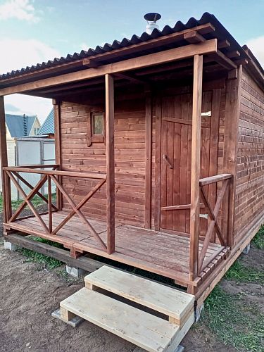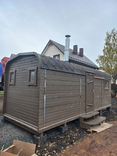 Всю зиму выбирали баню, смотрели сайты, цены сравнивали. Очень уж понравилась буханка. Необычная и вместительная. Мы еще попросили ее в цвет покрасить, получилась еще лучше. Встала на место у забора, очень удобно лишнее место не занимает и красиво смотрится. Паримся не нарадуемся, в такой красоте это двойное удовольствие! Спасибо компании, рекомендуем.